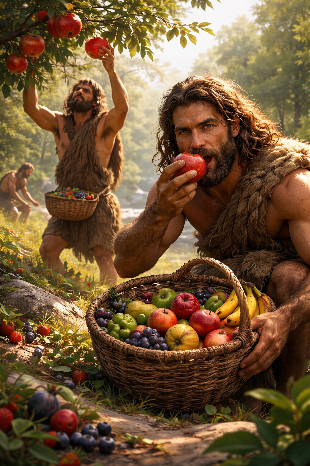As frutas foram essenciais para a sobrevivência dos primeiros seres humanos. Antes da agricultura existir, elas forneciam energia rápida, vitaminas e água, ajudando nossos ancestrais a sobreviver e evoluir ao longo de milhares de anos.